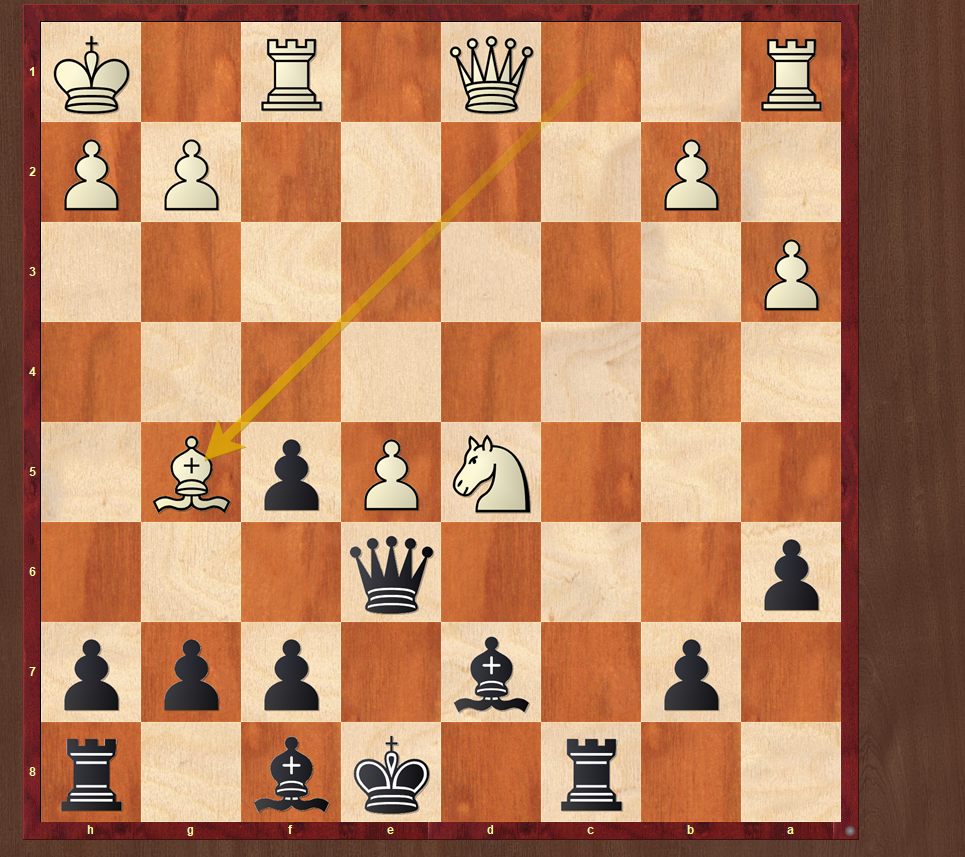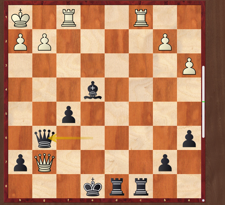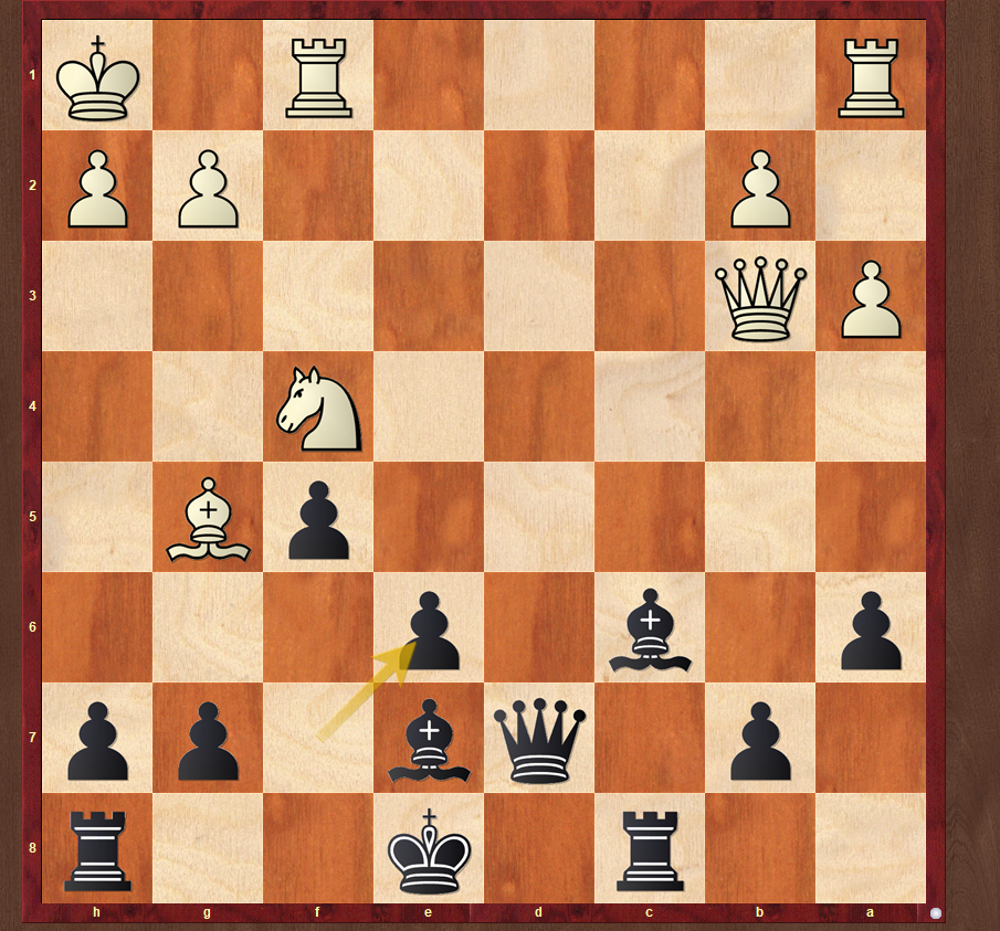 Nun hätte ich nach Tad1 erneut die Segel streichen können. Wichtig war hier, dass Sxe6 wegen Ld5 Sxg7 Kf7 und Txf5+, wegen Dxf5 nicht direkt funktionierte, was wir beide sahen, allerdings wäre statt Txf5+ Dg3 furchtbar stark gewesen, weil sich Schwarz nicht mehr rühren kann und 1000 Abzüge drohen. In der Partie geschah aber LxL und KxL, was auf den ersten Blick auch verlockend aussah, aber hier folgte nach Tad1 Ld4! Nun schlug mein Gegner auf e6 ein und dachte, der b7 Bauer hinge mit Schach mit, welcher aber durch den Läufer gedeckt ist, somit folgte ein Damenschach. Wer aber glaubt, dass die Partie einfach gewonnen ist mit wenig Zeit, irrt sich.