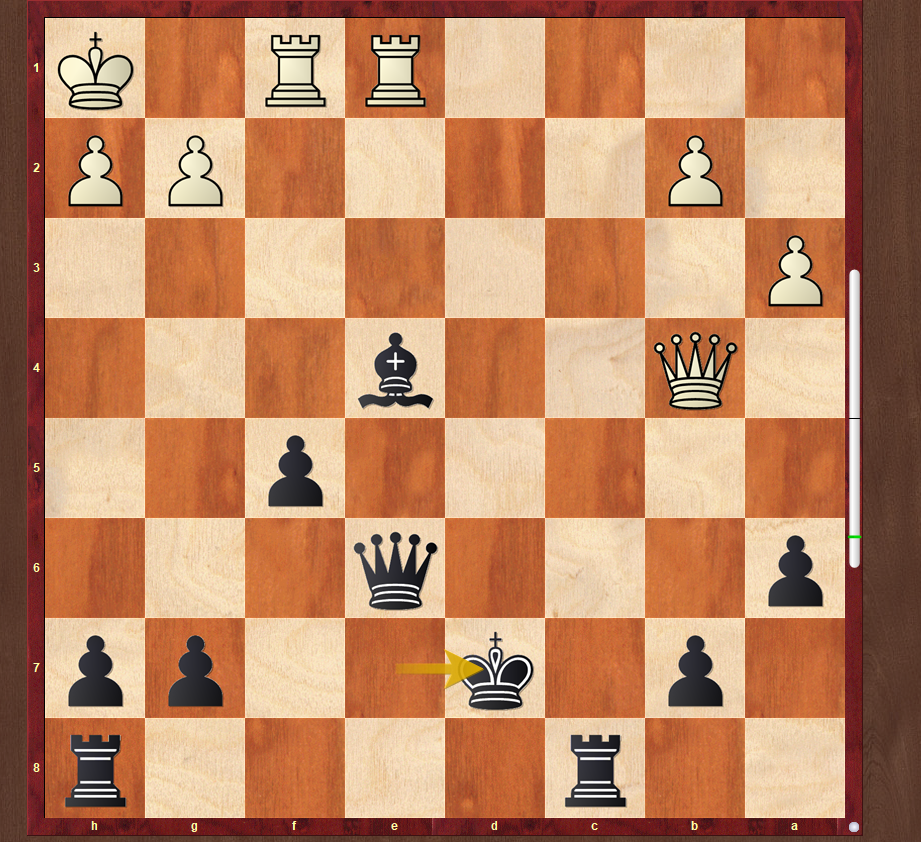 Nach Dd4+ Kc7 Da7 hängt der König schon wieder halb in der Luft. Es war schon spät geworden und ich war nicht mehr klar im Kopf, denn Db6 nebst Lc6 sichert die Partie. Stattdessen lief ich mit dem König zurück ins Zentrum, um mich so vor den Schachs der Türme zu verstecken. Am Ende fand sich folgende Stellung am Brett.