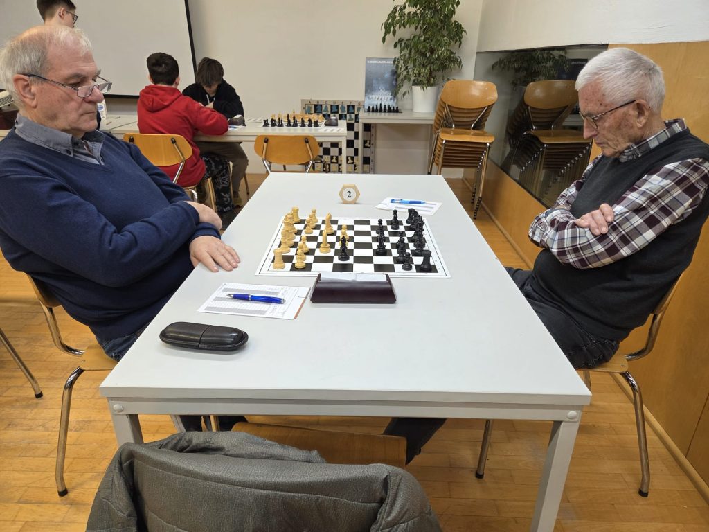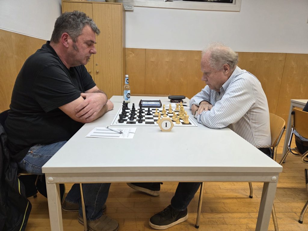 Die Begegnung zwischen Konstantin Stadler und Erwin Sattler war selbst für unsere Fotografin zu rasch aus, während die Partie zwischen Georg Weiler und Emil Vergeiner wegen einer Verhinderung Vergeiners am grünen Brett zugunsten Weilers entschieden wurde. Weiler belegt damit den dritten Rang in der Zwischentabelle.