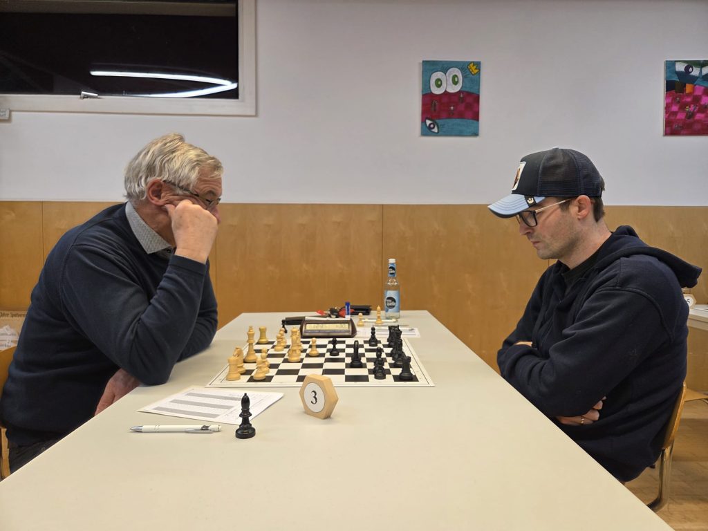 Robert Oberbichler, von seinem Gegner und Mannschaftskollegen Raphael Meier mit einem Italiener am Brett alleingelassen. Bald sollte sich das Stellungsbild deutlich verschärfen, was zu Stellungsvorteil für Meier führte, am Ende aber zu einem vollen Erfolg Oberbichlers.