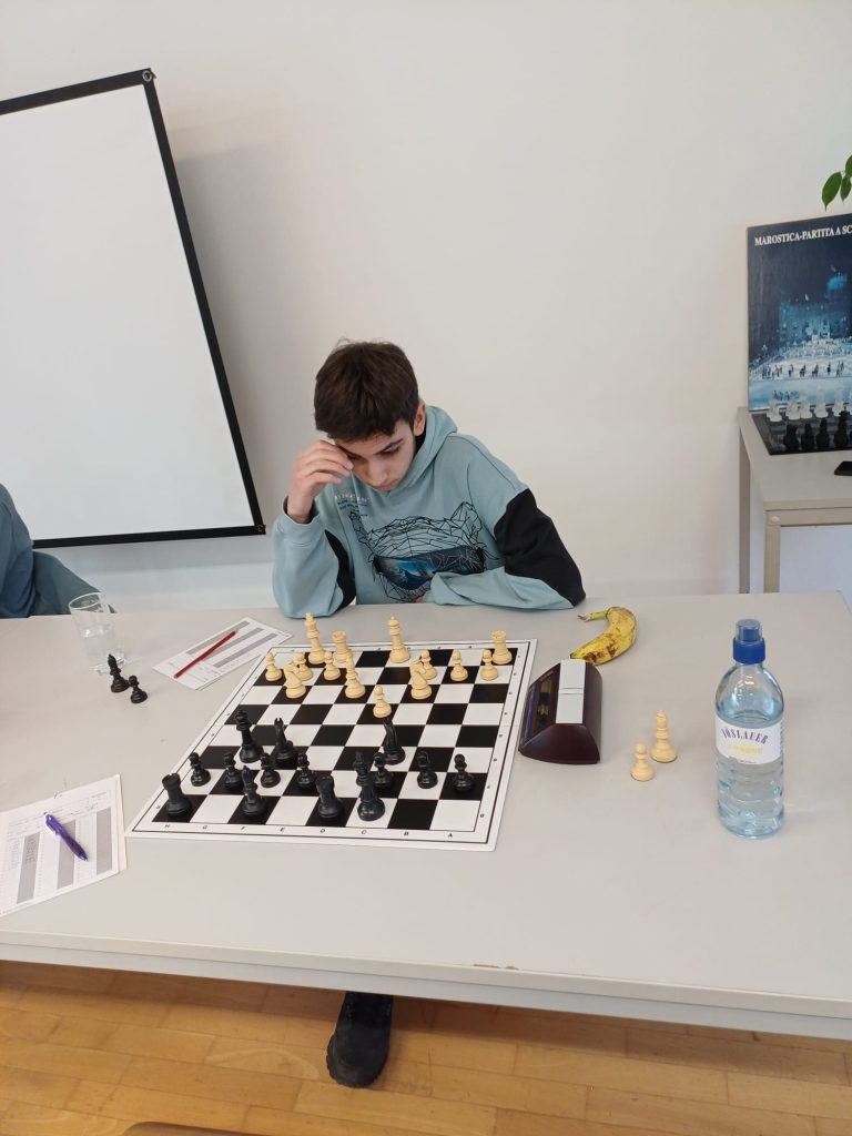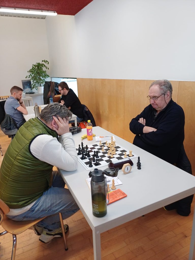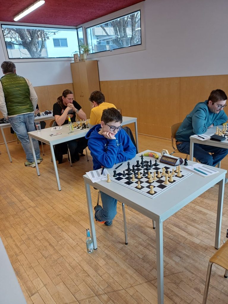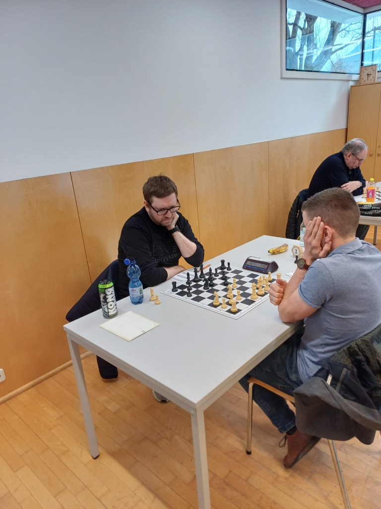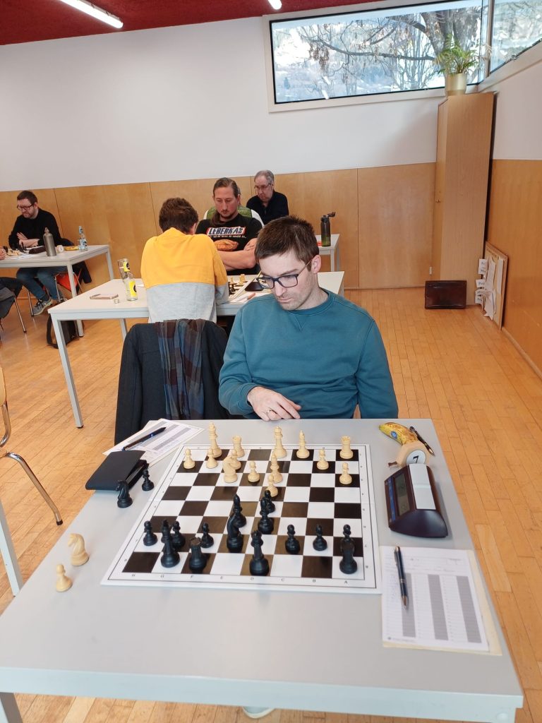 Michael zeigte sich in einem scharfen Sizilianer bereit für einen Kampf mit offenem Visier gegen den spielstarken Konstantin Meglitsch. Am Ende teilte man sich den Punkt.Christopher Stadler hat im vergangenen Vierteljahr 68 Elopunkte dazugewonnen. Gestern fiel er jedoch einer „petite combinaison“ Heinz Kanzians zum Opfer, musste eine Qualität geben, und konnte die Stellung in der Folge nicht mehr halten.Konstantin gewinnt im Jugendbereich regelmäßig Pokale und Medaillen. Gestern holte er sich mit starkem Spiel den „Skalp“ des sichtlich verblüfften Johannes Lenzhofer. Damit konnte Konstantin einen wichtigen Grundstein für den Mannschaftserfolg legen und war nach der Partie zu Recht sehr zufrieden!Paul zeigt sich am Einserbrett in der laufenden Saison wie gewohnt genau vorbereitet und bewältigte den technischen Teil seiner Partie auch gestern wieder überzeugend. Sein Gegner Alexander Götz (Elo 2185), der nach längerer Spielpause wieder ins Turniergeschehen eingestiegen ist, musste neidlos Pauls Überlegenheit anerkennen. Götz ist übrigens Autor des erfolgreichen Buches „Schach! Dem Manager“. Paul hält damit in der Meisterschaft bei 4,5 Punkten aus fünf Partien und damit einen phantastischen Rekord!Markus Amon konnte sich gestern nach einem guten Kampf über ein Remis gegen Michael Lenzhofer (Elo 1788) freuen. Seine Stellung war nie gefährdet gewesen, ein Remis das folgerichtige Ergebnis.Robert Oberbichler gegen Claudio Plozner: Nach ruhigen ersten Zügen ging die Partie bald in taktische Fahrwasser über und Oberbichler schien Vorteil zu haben. Am Ende zeigte sich aber, dass Plozners Verteidigung standhielt. Remis.Die Partie zwischen Andi Amon und Josef Berger sollte die längste des gestrigen Nachmittags werden. In einer ausgeglichen wirkenden Mittelspielstellung gelang es dem sich in bestechender Form befindlichen Andi, seinen Gegner zu überspielen, nach knapp vier Stunden den Sieg einzufahren, und damit auch den Mannschaftserfolg in trockene Tücher zu bringen. Andi, der alle Partien der laufenden Saison bestritten hat, bleibt damit weiterhin ungeschlagen. Er hält damit bei vier Punkten aus sechs Partien.